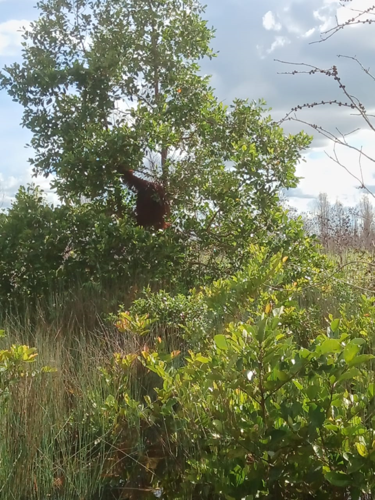 “Siang itu, dari kejauhan saya melihat dengan mata kepala saya sendiri berwarna merah gelap kecokelatan, langsung tahu kalau itu sosok penjaga hutan desa, tidak lain ya Orangutan” Ucap Guni dengan Bahagia karena bisa bertemu Orangutan.