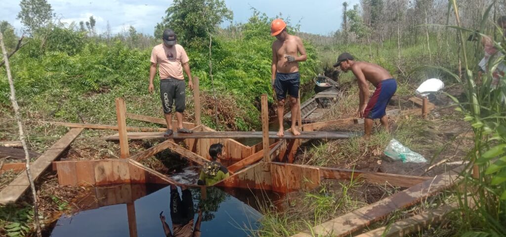 Fitur fisik yang jelas terlihat sosok laki-laki gagah berdiri. Terlihat sedang memantau dan turun tangan memeriksa setiap inci balok kayu, tangan yang bergerak meneliti dan memastikan pondasi sekat yang kokoh. Laki-laki itu adalah Sarianto (48) yang menjadi pemimpin kegiatan pembangunan sekat kanal sekaligus sebagai Technical Officer (TO) KPSHK.