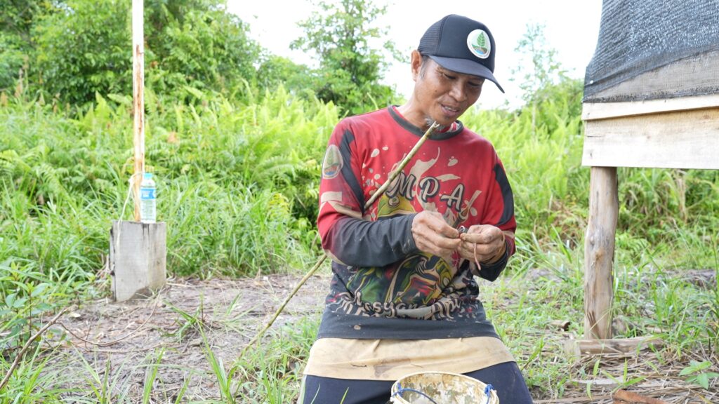 “When I was working on the well drilling, I passed by here. I saw the water surface was calm, with bubbles appearing, and the occasional fish surfacing. So I tried fishing here, hoping I’d catch quite a few,” Yusran said, pointing to the area along the banks of the Sala River in question. He also attached a piece of bait called cacaing (a type of fish) to the hook of a banjur fishing rod that would be placed at several points in the Malang River. He amiably shared that he had been a member of the MPA (Masyarakat Peduli Api) and had been entrusted with the role of team treasurer.