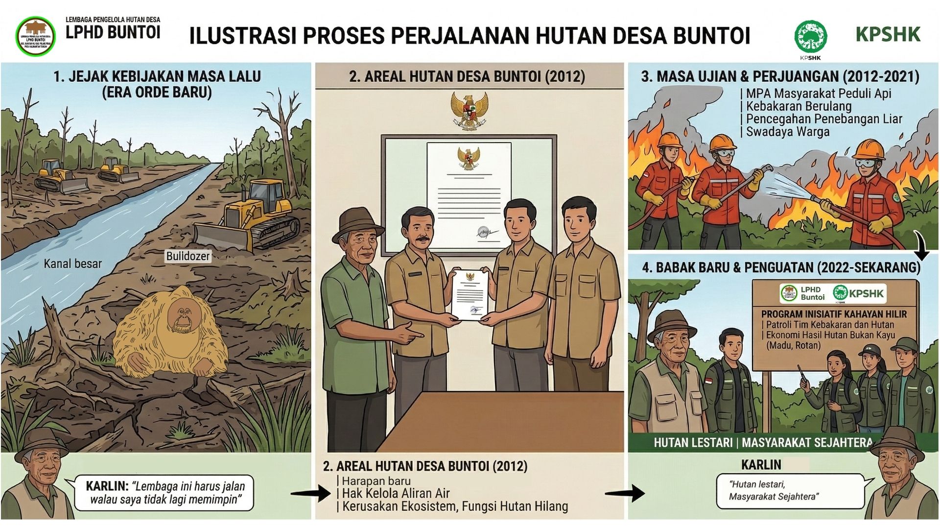 In 2012, the Ministry of Forestry designated a protected forest area as the Buntoi Village Forest work area. The area is located in Kahayan Hilir District, Pulang Pisau Regency, Central Kalimantan Province. This designation granted the community management rights through a village forest scheme.